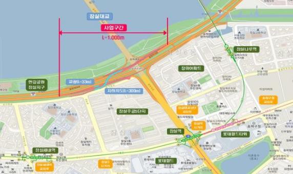 잠실대교 남단IC은 만성적인 교통체증을 해소하기 위해 올림픽대로(하남→김포방향)에서 한가람로(종합운동장방향)로 바로 진입할 수 있도록 지하차도(폭=6m, 길이=300m)가 신설되고 올림픽대로 진출입 도로가 추가된다. 총 연장 3.33㎞이며, 총 사업비는 447억 원이 투입된다.