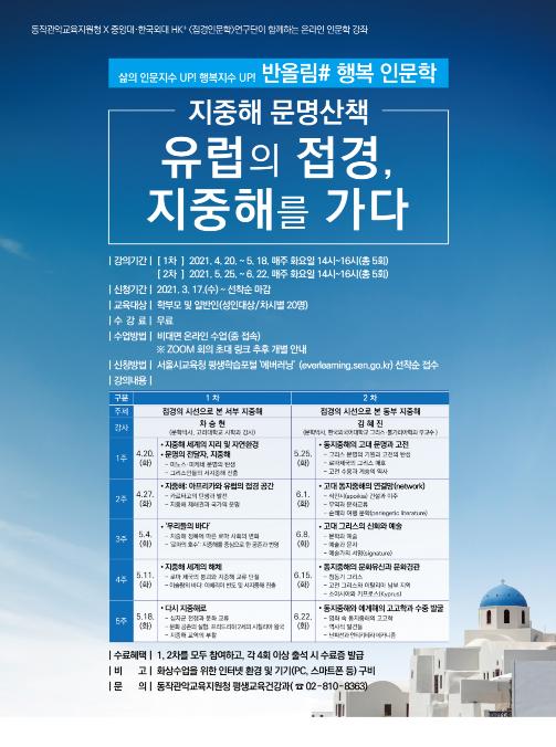 강의는 ‘지중해 문명 산책 - 유럽의 접경, 지중해를 가다‘를 주제로 총 10회에 걸쳐 비대면 온라인 수업으로 진행되며, 관련 분야의 전문가의 수준 높은 강의를 온라인으로 만날 수 있다.