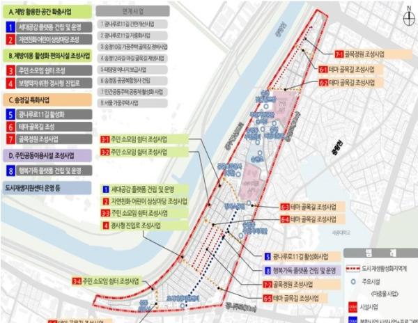 송정동 활성화계획의 주요사업은 ▲ 세대공감 플랫폼 건립 ▲ 자연친화 어린이 상상마당 조성 ▲ 주민 소모임 쉼터 조성 ▲ 보행약자 위한 경사형 진입로 조성 ▲ 광나루로11길 활성화 ▲ 테마골목길 조성 ▲ 골목공원 조성 ▲ 행복가득 플랫폼 건립 등 총 8개 사업으로 구성되어 있으며 오는 2023년까지 총 100억원을 투입하여 추진하게 된다.