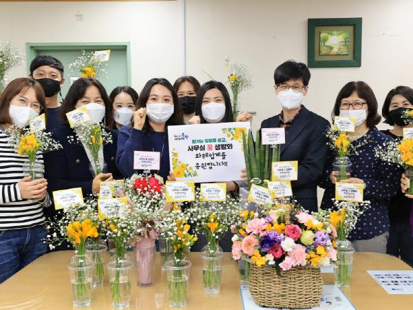 구입한 꽃(화분)은 ‘사무실 꽃 생활화, 화훼업계를 응원합니다!’의 메시지를 담아 사무실 내 민원응대 및 회의테이블 등에 비치돼 밝고 화사한 사무실 분위기를 조성한다.
