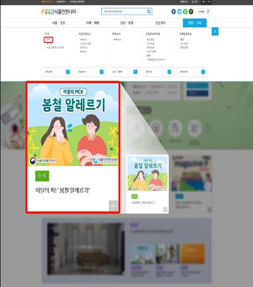 3월에는 ‘봄철 알레르기’를 주제로 알레르기를 일으키는 식품의 대체 식품, 알레르기 표시제, 자주 묻는 질문 등에 대해 소개하고 있으며 내용을 조회하면 해당 서비스로 이동되어 보다 상세한 내용을 확인할 수 있다.