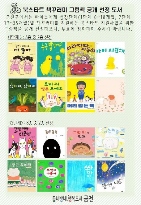 그림책 공개선정은 금천구 홈페이지 금천소식 게시판을 통해 누구나 참여할 수 있다. 온라인을 통해 총 16권(단계별 8종)의 후보도서 중 선호하는 책을 단계별 2종씩 총 4권을 선택하면 된다.