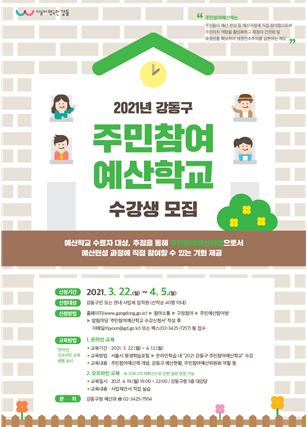 온라인 교육은 3월 22일부터 4월 12일까지 서울시 평생학습포털에서 “2021 강동구 주민참여예산학교” 강의로 진행된다. 오프라인 교육은 피드백 공유와 사업제안 직접 실습을 위해 4월 19일 구청에서 진행된다.