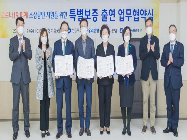 [한국쇼핑몰뉴스, 최영진기자] 영등포구가 17일 상공인의 날을 맞아 서울신용보증재단을 비롯해 2개 금융기관(우리은행, 하나은행)과 함께 코로나19 피해 소상공인 지원을 위한 특별보증 출연 업무협약을 체결했다.