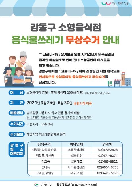[한국쇼핑몰뉴스, 최영진기자] 강동구가 코로나19 장기화로 어려움을 겪고 있는 소상공인 지원을 위해 200㎡ 미만 소형음식점 음식물쓰레기 무상수거를 3월 24일부터 6월말까지 재실시한다고 밝혔다.