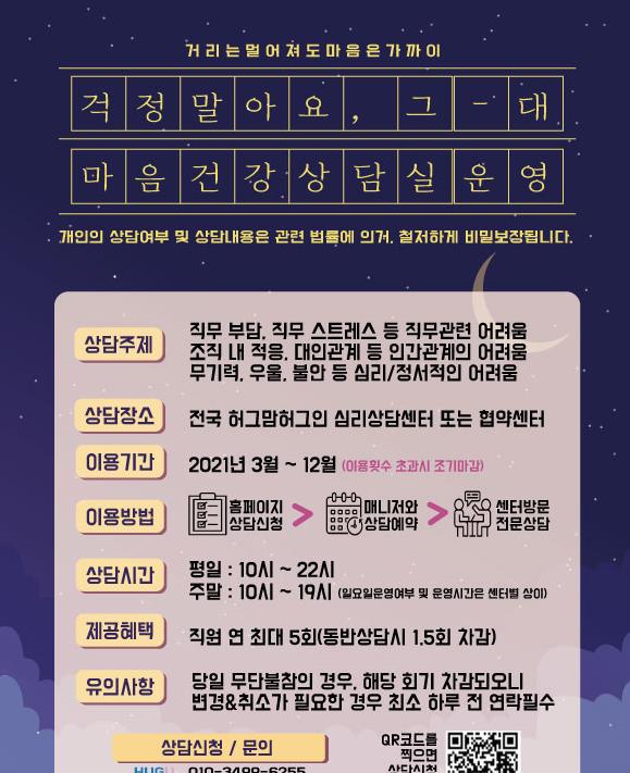 상담은 특정 분야에 국한하지 않는다. 직무 스트레스, 조직 내 적응 및 대인관계, 무기력·우울·불안 등 심리정서적인 어려움을 개인별 맞춤상담으로 진행하게 된다.