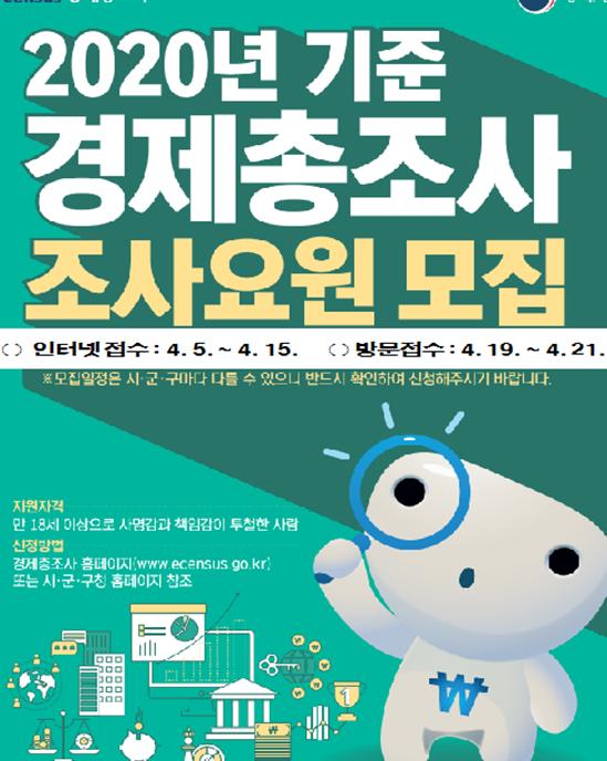 모집대상은 만 18세 이상 사명감과 책임감이 투철한 자로써 통계업무에 전념할 수 있어야 하며, 최종합격자는 4. 23. 구 홈페이지에 공표될 예정이다.