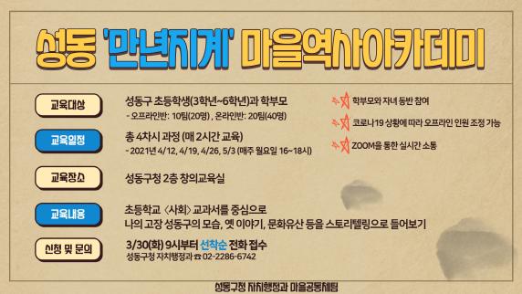 [한국쇼핑몰뉴스, 최영진기자] 서울 성동구는 4월 12일부터 5월 3일까지 학부모와 초등학생 자녀가 함께 참여할 수 있는 우리고장 성동 바로알기 교육 ‘만년지계 마을아카데미’를 운영한다.