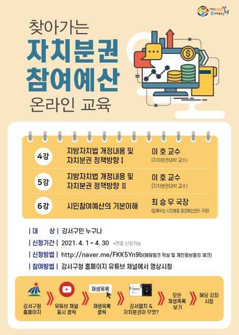 [한국쇼핑몰뉴스, 최영진기자] 서울 강서구는 구민의 자치역량 강화를 위해 ‘찾아가는 자치분권‧참여예산 온라인 강좌’를 운영한다고 밝혔다.