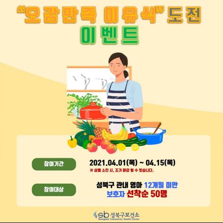 성북구민 중 12개월 미만의 영아 양육자라면 누구나 참여 가능하며 행사 기간 2021.04.01.(목)~2021.04.15.(목)에 참여자에게는 선착순으로 이벤트 상품이 지급되며 레시피 인증 개수에 따라 추가 상품도 지급이 된다.