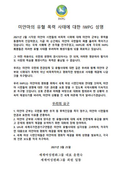 ㈔세계여성평화그룹(IWPG, 대표 윤현숙)이 3월 25일 미얀마 국민의 인권침해 및 유혈사태로 인한 인권 위기에 대해 우려를 표하고, 미얀마 군부와 시위대가 폭력이 아닌 비폭력적이고 평화적인 방법으로 사태를 해결해 나갈 것을 촉구하는 성명을 냈다.