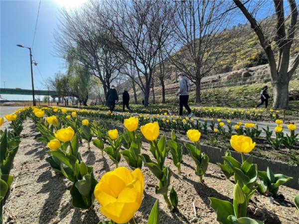 구는 지난해 11월 용비교 하부에서부터 응봉체육공원까지 약 1.2km구간에 걸쳐 빨강, 노랑, 흰색, 보라, 분홍 등 6개 색상, 총 7만 5천개의 튤립 구근을 식재했다.