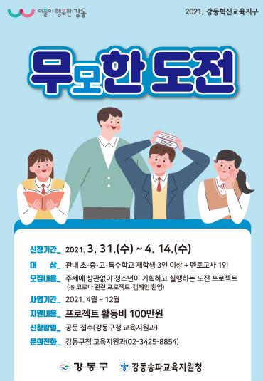 [한국쇼핑몰뉴스, 최영진기자] 강동구가 청소년들이 청소년들의 프로젝트 도전과 동아리 활동을 지원하기 위해 '무모한 도전', '반하는 학교', '우리학교 문화예술 동아리' 참여자를 오는 14일까지 모집한다.