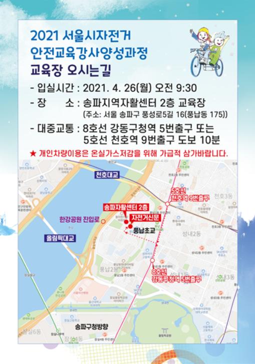 서울시 자전거 강사 양성과정 교육을 이수한 후 강사자격 인증시험(이론‧실기시험)을 통과하면 자전거 강사 자격증을 취득할 수 있다. 자전거 강사 양성과정 교육생은 올해 총 4기수 모집할 예정이다. 1기수 교육은 4월 26일부터 총 5일간 25시간 과정으로 진행된다. 코로나19 감염 방지 및 교육의 효율적 운영을 위해 기수당 교육인원은 최대 20명으로 제한된다. 자전거 강사로서 활동할 수 있는 자질과 성품을 갖춘 서울시민이면 누구나 신청 가능하다. 학교/기관/단체 교육 관련자일 경우 우대한다.