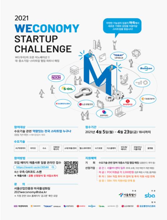 서울시와 서울산업진흥원(SBA)이 마곡산업단지에 입주한 대기업과 중견기업의 우수한 역량‧인프라와 혁신기술을 보유한 유망 스타트업을 매칭, 기술혁신 시너지를 통해 신산업 비즈니스 모델을 만드는 오픈 이노베이션 2021 위코노미 스타트업 챌린지(2021 Weconomy Startup Challenge)를 연다.