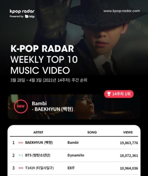 백현의 신곡 ‘Bambi(밤비)’ 뮤직비디오는 케이팝 레이더 14주차 집계 기간 (3월 28일 ~ 4월 3일) 동안 1,986만 뷰를 기록하며 1위에 올랐다.