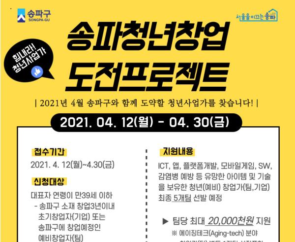구는 지난해 ‘송파 청년창업도전프로젝트’를 통해 코로나19로 투자유치에 어려움을 겪는 청년창업자 10개 기업을 지원했다. 그 중 7개 기업에서 상시근로자 수(12명 증가)와 매출액 증가의 성과를 도출하기도 했다. 올해에는 2019년, 2020년 참여기업들의 현황을 파악하고 송파ICT청년창업지원센터와 연계하여 사후관리 실시 할 계획이다.