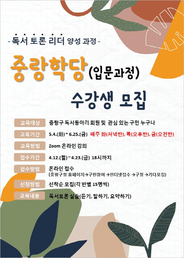 ‘중랑학당’은 경쟁식 토론이 아닌 다른 사람과 의견을 공유하고 이를 통해 책을 더 깊이 있게 읽는 입체적인 독서에 대해 배우는 프로그램이다. 독서공동체 숭례문학당의 최병일 대표강사가 과정을 이끌며 상반기에는 입문과정, 하반기에는 심화과정이 열린다.