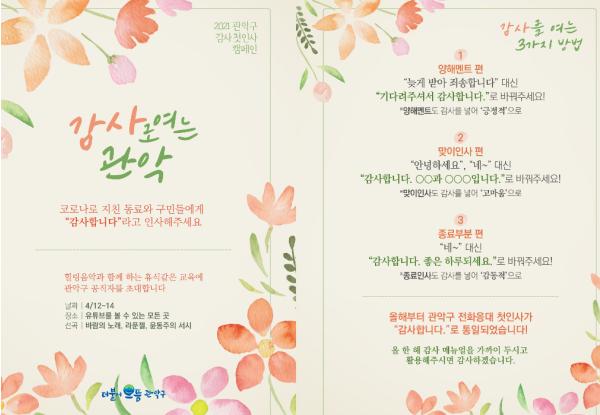 앞서 구는 전화응대 첫인사를 “감사합니다”로 통일, 코로나19로 지친 구민과 동료들에게 감사의 마음을 전하고, 간략한 인사말 사용으로 자연스럽고 신속한 상담이 이루어질 수 있도록 했다.