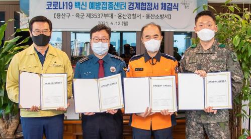 [한국쇼핑몰뉴스, 최영진기자] 서울 용산구가 12일 육군제3537부대 3대대, 용산경찰서, 용산소방서와 함께 신종 코로나바이러스(코로나19) 백신 예방접종센터 경계협정을 맺었다.