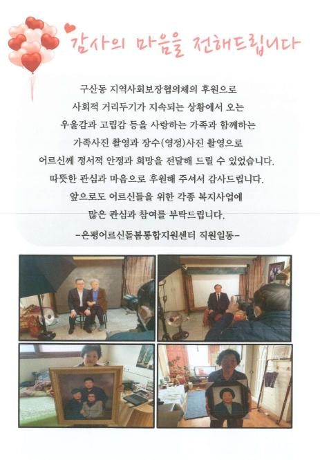 협의체는 사회적 거리두기 지속 상황에서 오는 우울감과 고립감 등을 사랑하는 가족과 함께하는 가족사진 지원을 통해 어르신께 정서적 안정과 희망을 드리고자 지난 12월 가족사진 촬영권을 전달하였고, 코로나 상황에서 가족모임 및 사진관 방문일정 등을 고려해 올해 3월까지 사진 촬영을 완료하였다.
