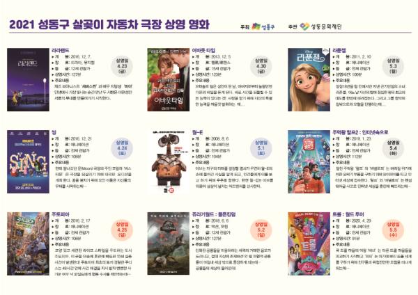 성동구 자동차극장은 오는 이달 4월 23일부터 내달 5월 5일까지 살곶이 체육공원 내 대운동장에서 총 9회에 걸쳐 운영될 예정이다. 특히 5월 1일부터 5일까지는 어린이날을 맞이하여 어린이들을 위한 「Children Week」 테마로 진행된다.