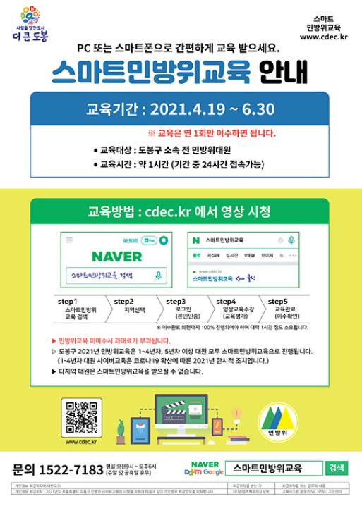 한편, 도봉구는 지난 2019년부터 5년차 이상의 민방위대원을 대상으로 비상소집훈련 부담완화와 편리한 교육을 위해 스마트 민방위교육을 실시하여 왔으며, 작년에 이어 올해는 코로나19의 영향으로 사이버교육을 모든 민방위대원에게 확대 실시하게 됐다.