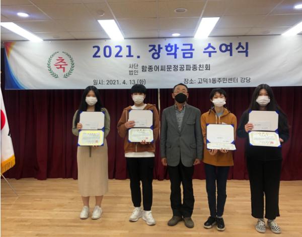 지난 13일 개최된 전달식에서 사단법인 함종어씨 문정공파 종친회(회장 어경찬) 서천장학회에서 학업성적은 우수하나 가정형편이 어려운 고덕1동 고등학생 2명과 대학생 2명(고등학생 각 100만원, 대학생 각 210만원)에게 장학증서를 전달했다.