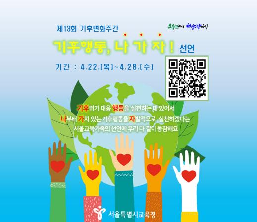 특히, 4월 22일 오후 1시 30분에는 온라인을 통해 교(직)원·학생·학부모가 참여하여「서울교육공동체 ‘기후행동, 나가자’」라는 슬로건으로 선언식을 연다. 각 교육 주체의 실천 의지를 담은 선언문 낭독과 학교·개인의 기후 위기 대응 실천 활동 상황 등을 공유할 예정이다.