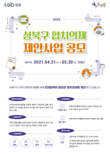 [한국쇼핑몰뉴스, 최영진기자] 서울특별시 성북구가 4월 21일부터 5월 20일까지 30일간 2022 성북구 협치의제 제안사업 공모를 실시한다.