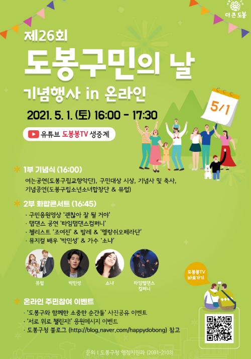 이동진 도봉구청장은 “구민의 화합과 단결을 위한 도봉구민의 날이 올해는 코로나19로 비대면으로 진행되지만, 화면을 통해서라도 서로 미소와 마음을 나누는 따뜻한 시간이 되길 바란다.”고 말했다.
