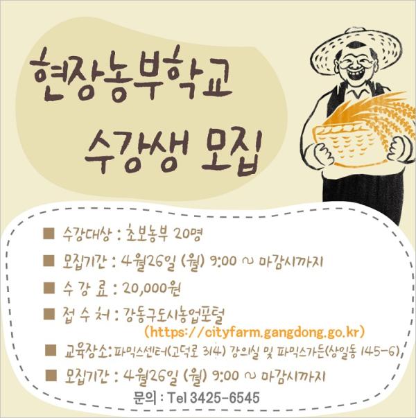 ‘도시텃밭 현장농부학교’ 수강을 원하는 주민은 4월 26일 부터 강동구도시농업포털사이트를 통하여 온라인으로 접수할 수 있으며, 교육 참가 및 프로그램 안내 등 기타 궁금한 사항은 강동구청 도시농업과로 문의하면 자세하게 안내받을 수 있다.