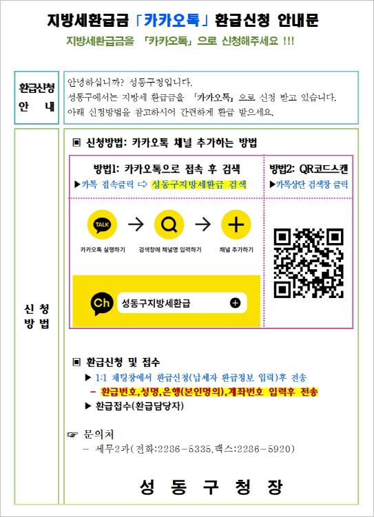 이에 스마트폰을 사용 간단하고 편리하게 환급금을 받을 수 있도록 카카오톡채널을 개설, “성동구지방세환급”의 채널을 통해 환급대상자의 환급금을 손쉽게 조회하고 돌려받을 수 있게 했다.