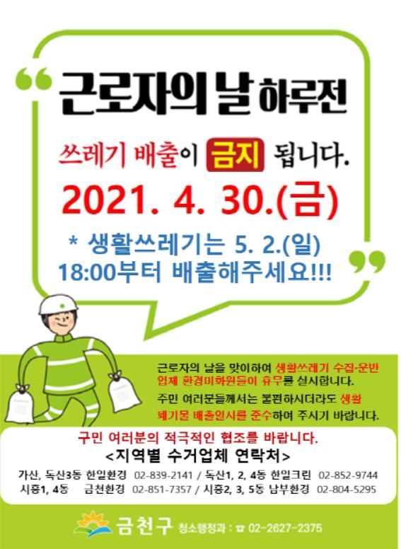 [한국쇼핑몰뉴스, 최영진기자] 서울특별시 금천구는 5월 1일 ‘근로자의 날’을 맞아 생활폐기물 수집·운반 업체 환경미화원들이 휴무를 실시함에 따라 4월 30일 저녁에 생활쓰레기를 수거하지 않는다고 밝혔다.