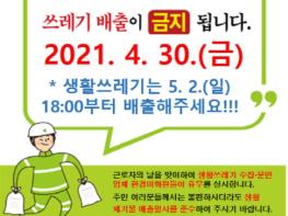 정찬배 청소행정과장은 “근로자의 날 생활쓰레기 수거 중단으로 주민 여러분께서 많이 불편하시겠지만, 주민 여러분들의 많은 이해와 적극적인 참여를 부탁드린다”고 말했다.