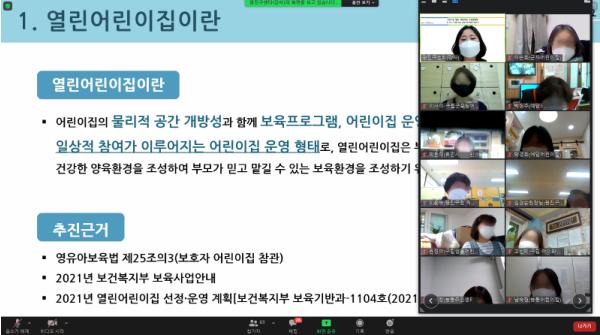 ‘열린 어린이집’은 보건복지부가 아동학대 근절대책의 하나로 추진하는 사업으로, 어린이집의 시설 개방과 부모 참여 활성화를 통해 부모가 믿고 맡길 수 있는 안심 보육 환경 조성에 목표를 두고 있다.
