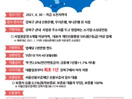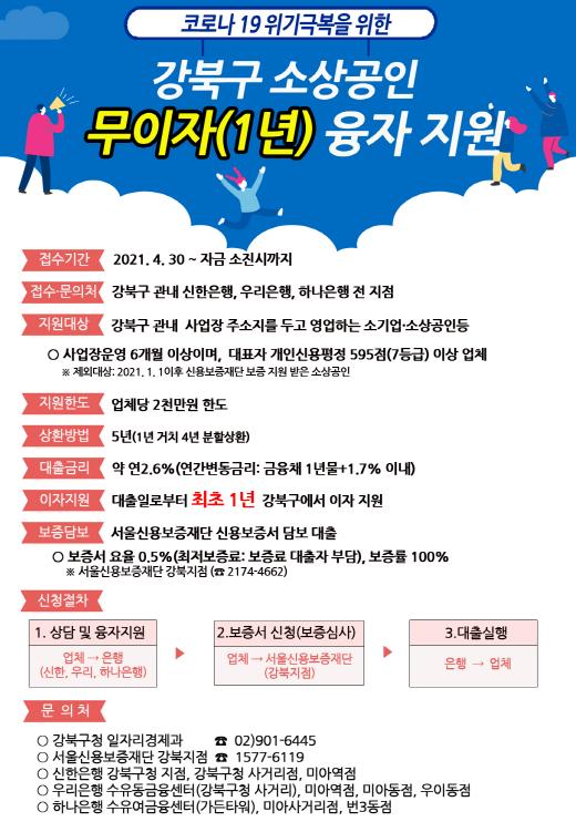 강북구 내에 사업장이 있으며 사업자 등록 후 6개월이 지난 사업주 중 개인신용평점 595점(구 7등급) 이상의 소상공인·중소기업이 신청 대상이다. 업체당 최대 2천만 원까지, 보증료 0.5%, 1년 거치·4년 분할상환 조건으로 대출받을 수 있다. 융자는 1년 무이자 지원 후 2.6% 수준의 1년 변동금리로 운영된다.