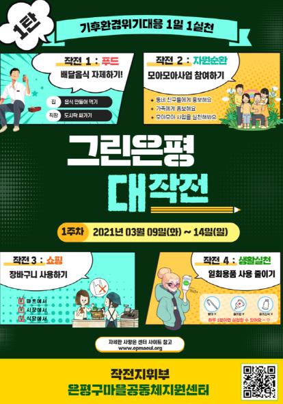 시리즈의 첫 번째로 7주 동안 진행 중인 그린은평대작전 1탄 <1일 1실천 함께 나누기>는 매주 4가지(쇼핑, 푸드, 생활실천, 자원순환) 영역의 실천사항과 기후위기 영상 시청을 주민들에게 제안하고, 매주 실천 결과를 센터 온라인 채널을 이용하여 기록, 공유하고 있다.
