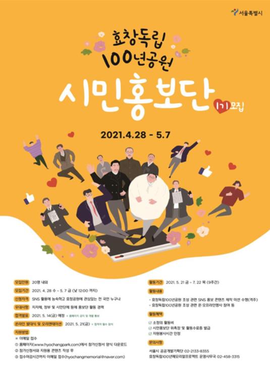 [한국쇼핑몰뉴스, 최영진기자] 서울특별시는 백범 김구 선생 등 독립운동가 묘역이 위치한 효창공원 일대를 독립운동 기념공간으로 조성하고자 “(가칭)효창독립 100년 공원 조성” 사업을 추진 중에 있으며, 이와 연계하여 시민참여 유도 및 콘텐츠를 통한 홍보확대를 위해 ‘효창독립 100년 공원 시민홍보단’을 운영한다고 밝혔다.