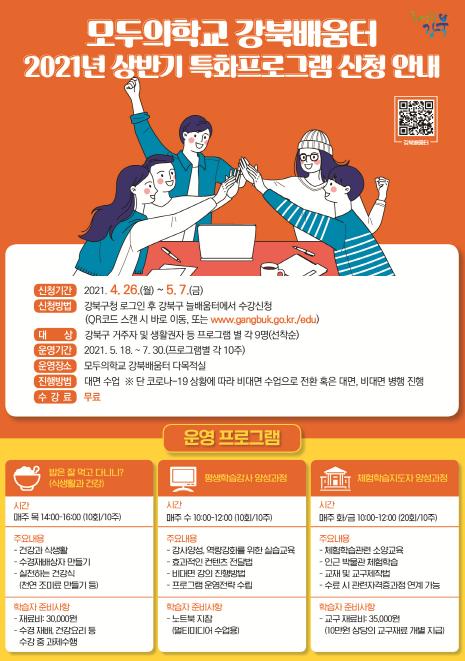[한국쇼핑몰뉴스, 최영진기자] 강북구가 5월 7일까지 모두의 학교 강북배움터 상반기 특화프로그램을 운영하고 학습자를 모집한다.