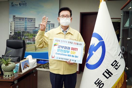 유 구청장은 ‘군부정권 OUT’, ‘문민정부 GO’, ‘Everything Will Be Ok!’(모든 게 다 잘될거야!) 문구와 세 손가락 경례로 응원 메시지를 전하며, “미얀마 군부의 폭압에 맞서 민주주의를 위해 투쟁하는 미얀마 국민을 지지하며, 하루빨리 민주주의의 승리를 통해 미얀마에 평화로운 봄날이 찾아오기를 진심으로 바란다”고 말했다.