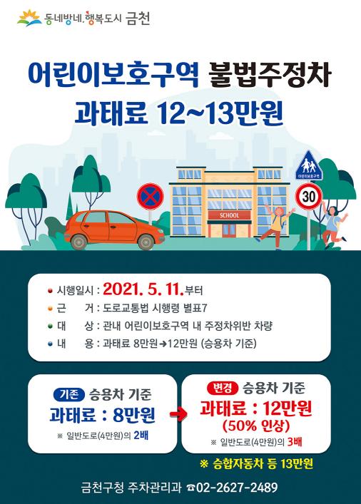 [한국쇼핑몰뉴스, 최영진기자] 금천구는 도로교통법 시행령 개정에 따라 5월 11일부터 어린이보호구역 내 불법주정차 과태료를 일반도로의 3배로 상향 부과한다고 밝혔다.