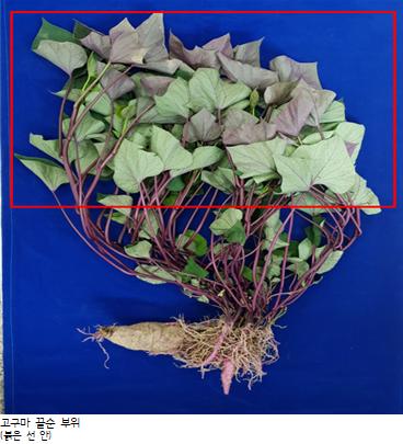 고구마 잎자루는 잎과 줄기 사이의 연결 부위이고, 끝순은 새로 나온 잎과 줄기를 포함한 끝부분을 말한다. 이번 연구 결과 고구마 끝순에 건강기능성 물질이 풍부하고, 생리활성 효과가 우수한 것으로 나타났다.