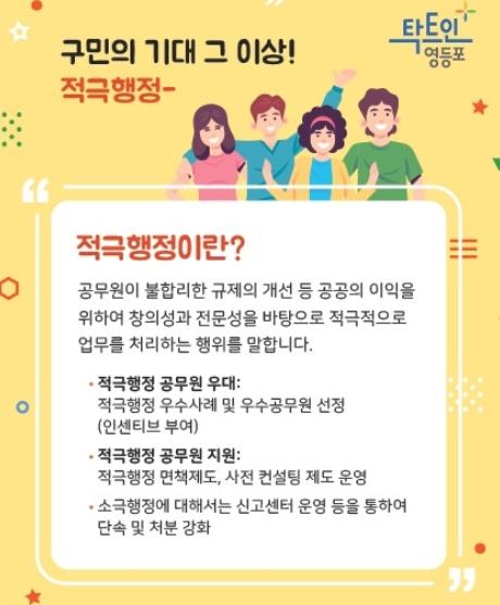[한국쇼핑몰뉴스, 최영진기자] 영등포구는 ‘2021년 적극행정 실행 계획’을 수립해 구민이 체감할 수 있는 적극행정 기반의 근무환경을 조성하고, 적극적으로 일하는 공무원이 대우받는 공직문화의 정착과 확립에 힘쓰고 있다고 밝혔다.