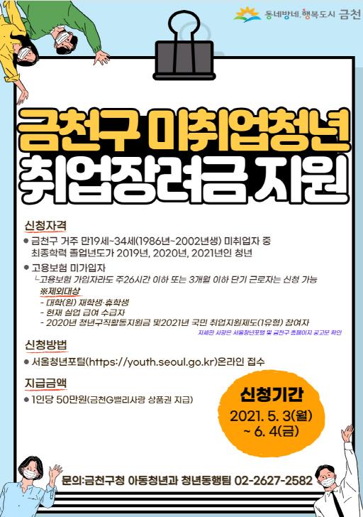 신청 대상은 주민등록상 금천구에 거주지를 두고 있는 만 19세에서 34세 청년으로, 최종학력(중퇴 ․ 제적 ․ 수료 ․졸업) 이후 2년이 경과하지 않고, 고용보험에 미가입된 미취업자다.