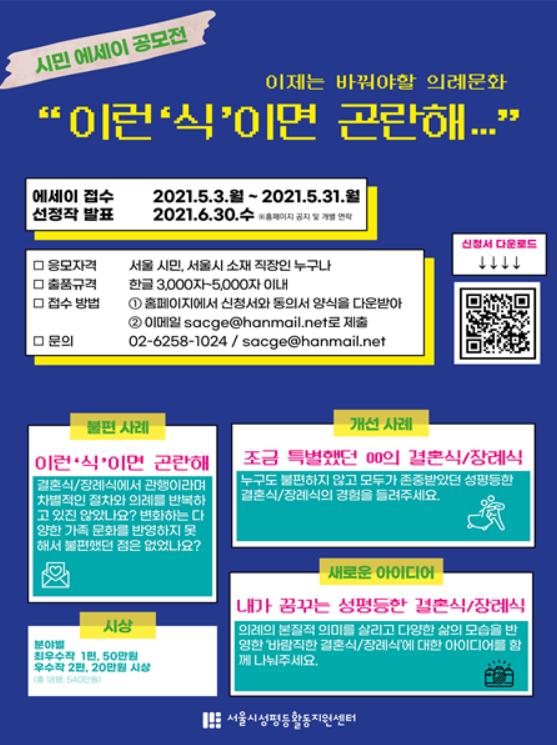 서울시 성평등활동지원센터는 5월 3일~5월 31일까지 서울시민이 참여하는 이제는 바꿔야할 의례문화 '이런 ‘식’이면 곤란해' 캠페인 시민 에세이 공모전을 개최한다.