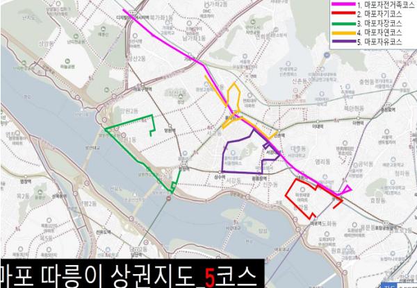 이는 서울특별시 공공자전거 따릉이에 대한 빅데이터 분석을 통해 마포구 내 따릉이 주요 이동경로와 주요 상권을 연결한 것으로, 상암과 공덕을 연결하는 ‘마포자전거족코스’, 마포역 2번출구부터 음식문화거리를 지나는 ‘마포자기코스’등 총 5개의 코스로 이뤄졌다.