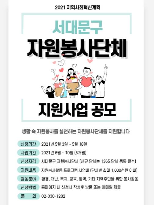 지원 대상은 서대문구 자원봉사단체로, 관내에서 자원봉사활동을 목적으로 하는 5인 이상 모임이면 ‘1365 자원봉사포털’ 단체 등록 후 참여할 수 있다.