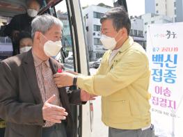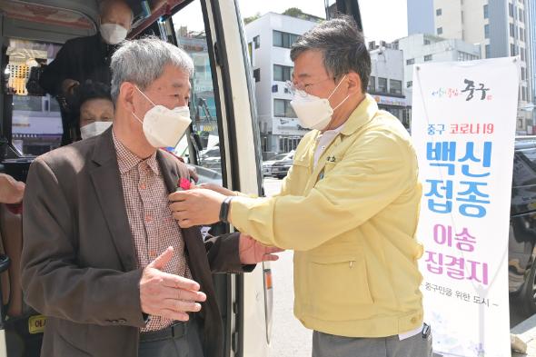 [한국쇼핑몰뉴스, 최영진기자] 서양호 중구청장이 다가오는 어버이날을 맞아 백신접종을 위해 중구예방접종센터에 방문하신 어르신들에게 카네이션을 달아드리고 있다.