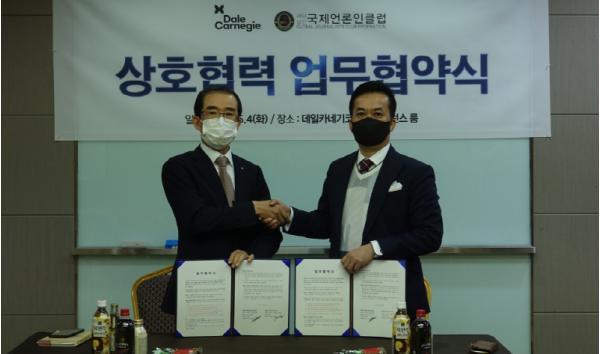 국제언론인클럽뉴스(GJCNEWS) & 라이프방송(LifeTV) & 월간 기부천사클럽저널를 운영하고 있는 ‘재단법인 국제언론인클럽(이사장 김재수,아태본부 총재 최종환)’과 국내 유수의 대기업에서 인정받은 글로벌 교육훈련 기관인 ‘데일카네기코리아(회장 최염순)’는 상호 교류와 협력을 위한 양해각서(MOU)를 2021년 5월 4일 데일카네기코리아 본사에서 체결했다고 관계자는 밝혔다.